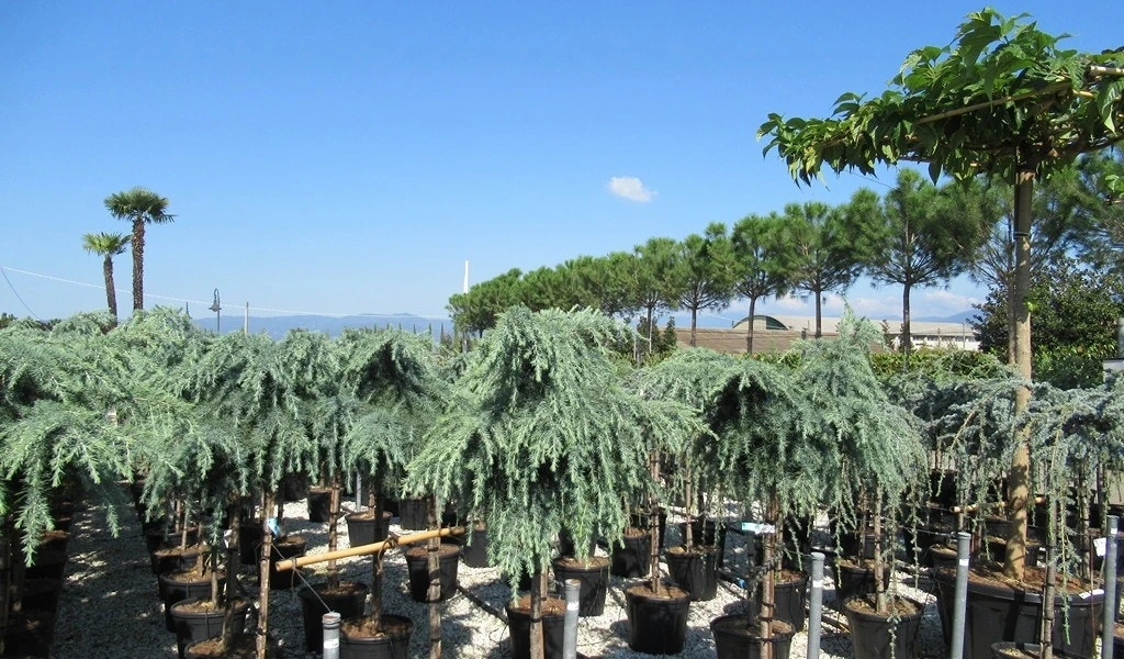 Cedrus libani ‘Glauca Pendula’ is een blauwe Treurceder. Hier is de Ceder als plant op stam gekweekt.